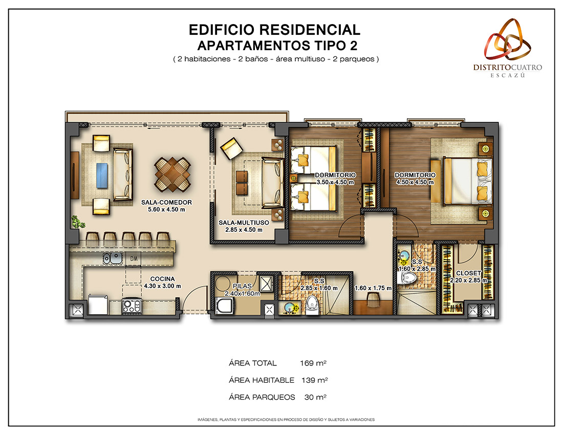 APARTAMENTO TIPO 2 2 habitaciones, área multiuso, 2 baños, 2 parqueos